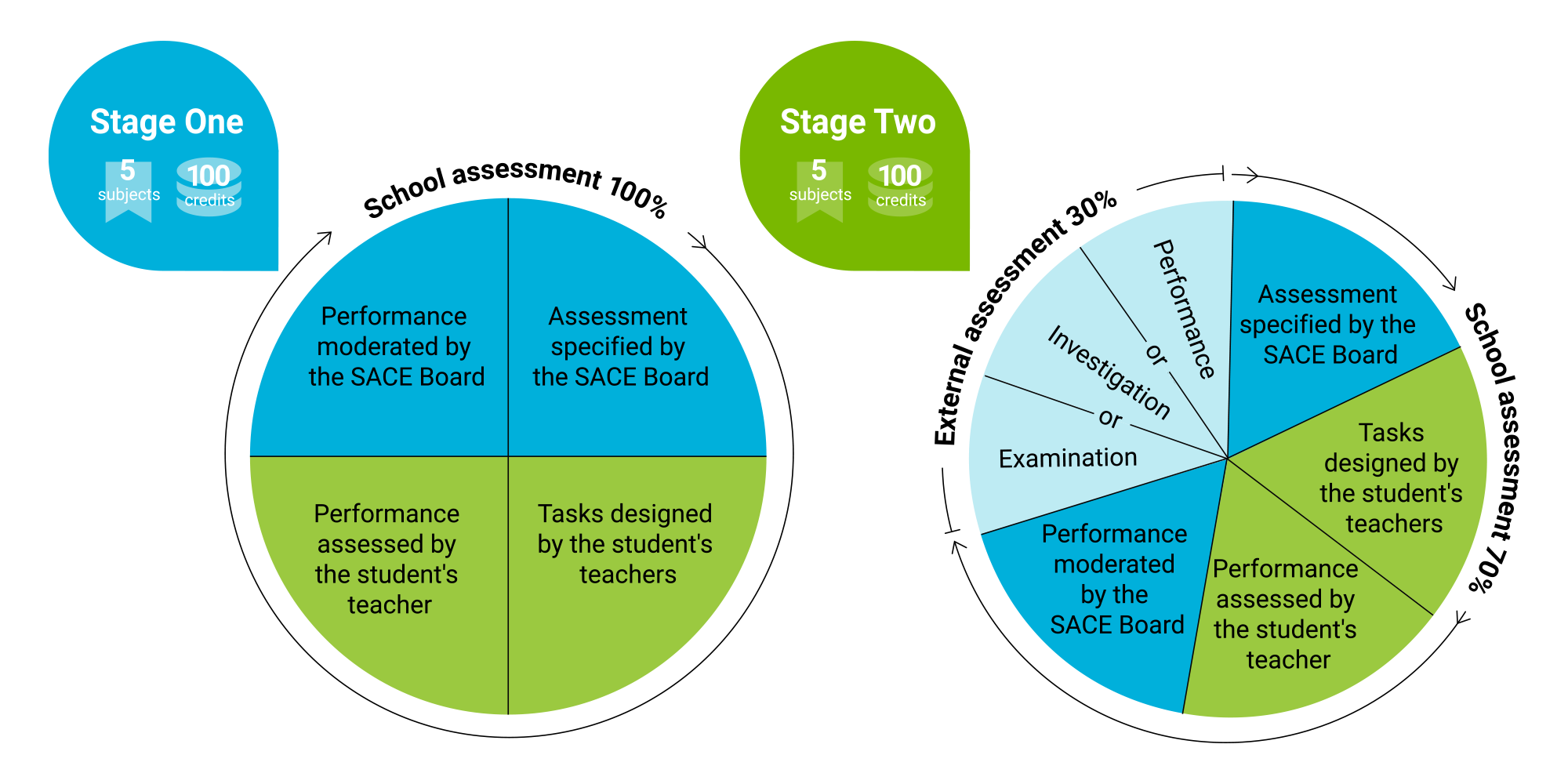 In Stage 1, students’ work is fully assessed by their school. Then in Stage 2, their work is 70 per cent assessed by their school and 30 per cent by the SACE Board.
