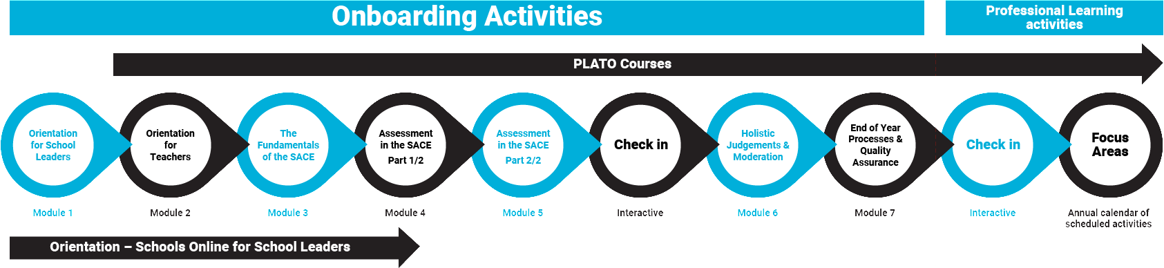 A series of seven modules and two check-ins’ will be delivered virtually over an 8–12 week period prior to all new schools commencing delivery of the SACE. Each module will be delivered by qualified SACE education consultants.