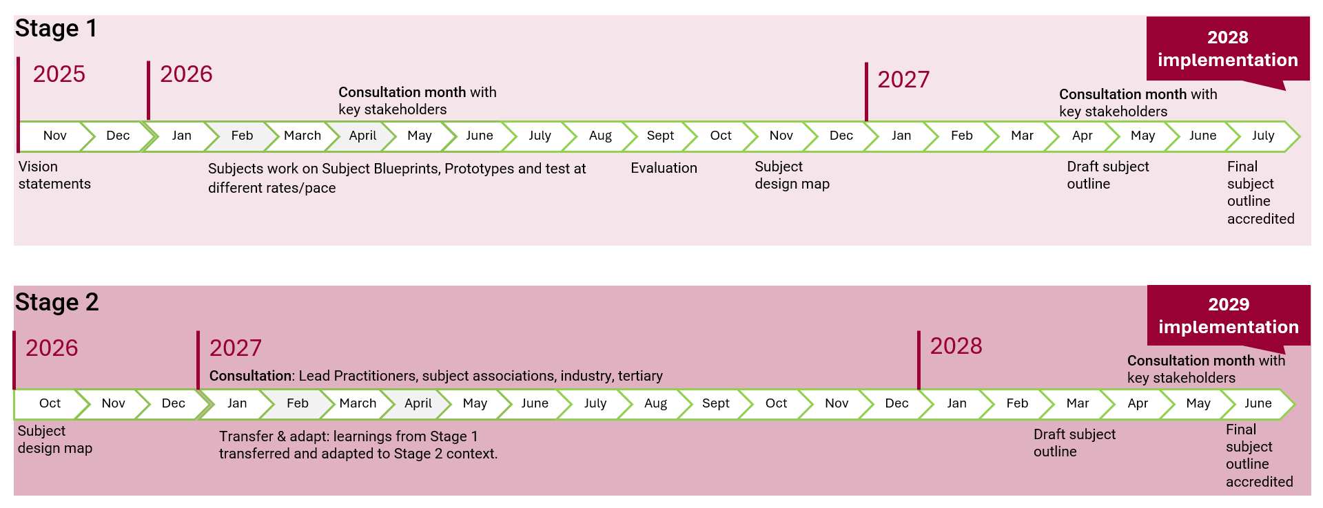 Subject Renewal Groups (SRGs), each focusing on a specific subject area, have been formed to carry out a co-design process that will consider the key drivers [PPTX 1.2MB] to sharpen content and assessment, and intentionally develop capabilities. Subjects have been separated into three groups and will progress at different paces, working through four key phases towards implementation, as outlined in our Subject Renewal roadmap.